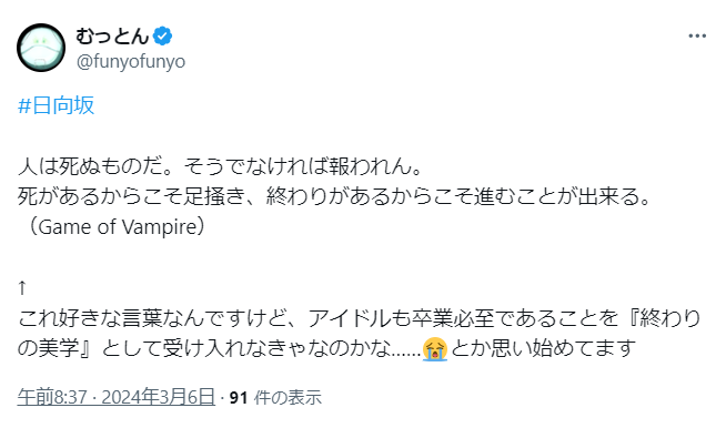「1年ほど演劇の仕事めっちゃやらせてもらいます」と言ったとしても、日向坂に居るままやってくれたら、それはそのまま日向坂の知名度向上になりますし、当然日向坂ファンは追いかけて見に行きますし、それで仕事を依頼した側は集客出来ますし、誰もがWinじゃん。
